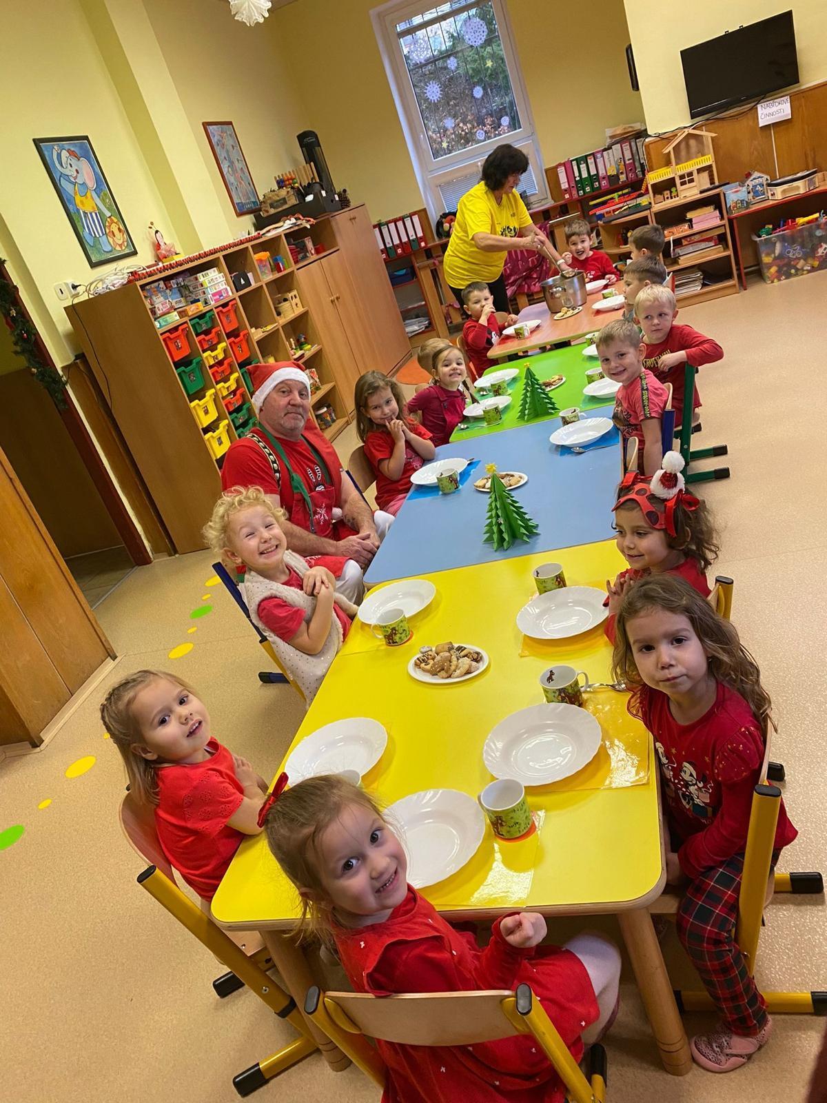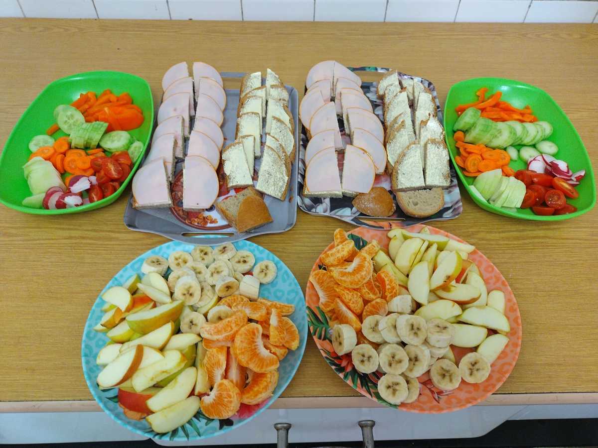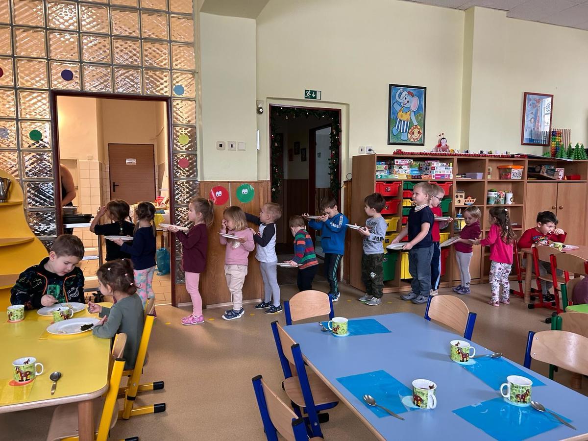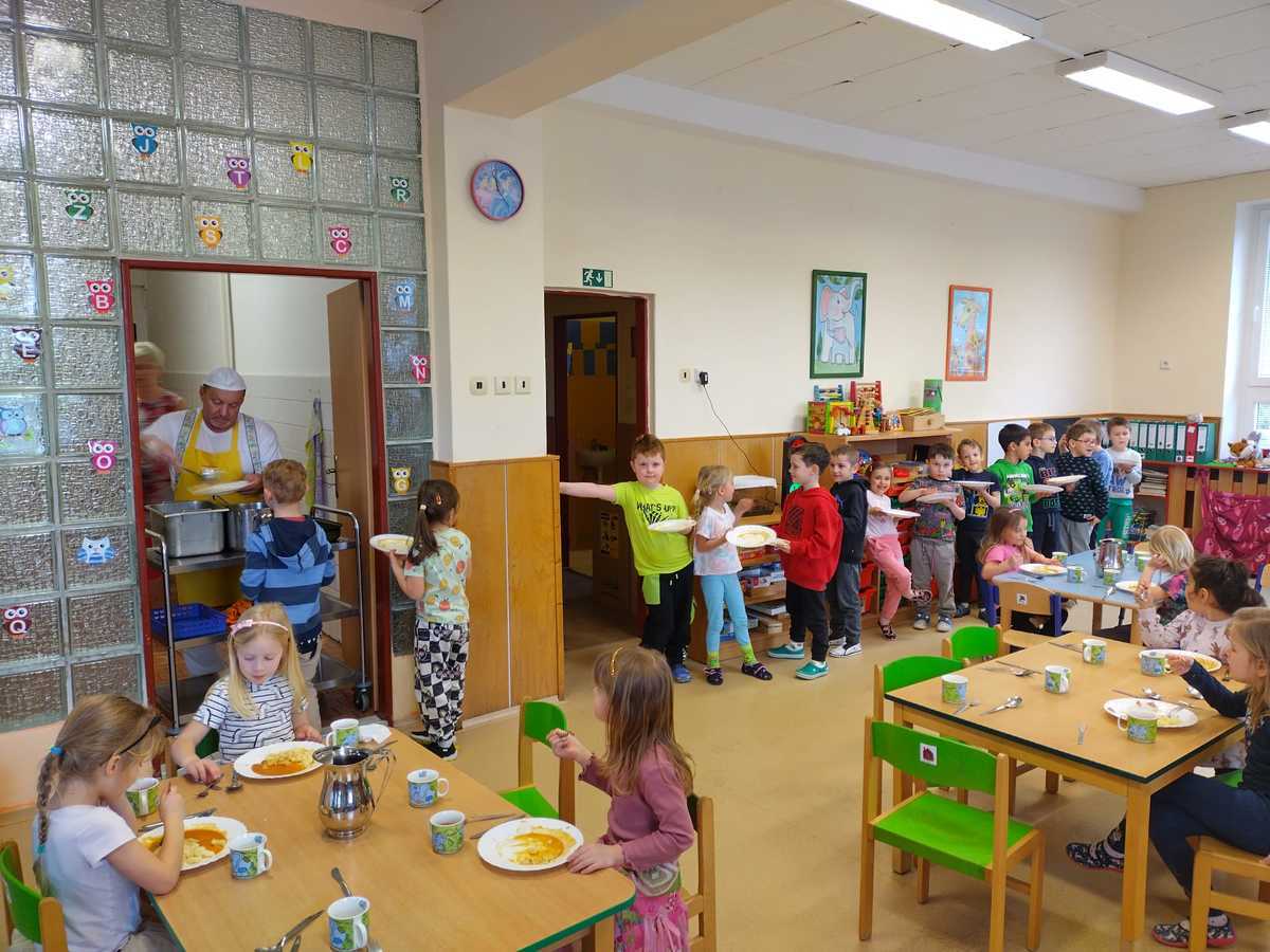 Naše školní kuchyně vaří z čerstvých ingrediencí, tak aby pokrmy byly co nejchutnější. Příprava pokrmů je vyvážená, dodržuje spotřební koš a přísné standardy pestré stravy. Děti si u oběda chodí pravidelně přidávat (viz foto níže) a velice jim chutná. Zároveň jsou každý den dětem servírovány svačiny bohaté na vitamíny a minerály v podobě širokého výběru zeleniny i ovoce. U svačinek nesmí chybět ani vícero možností pomazánek na chleba a dalších variací. Součástí odpolední svačiny jsou nejčastěji pomazánky, které si děti i sami mohou na chléb namazat. O pitný režim je o celý den postaráno, děti dostávají čaj a vodu. Často mají děti na výběr i mléko nebo kakao. Za takto bravurně zvládnutou práci odpovídá náš kuchař Jiří Český a kolektiv školní kuchyně.