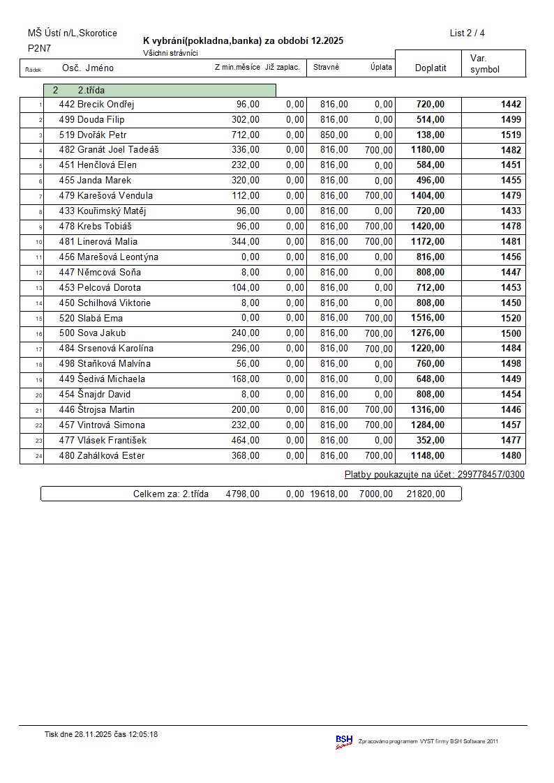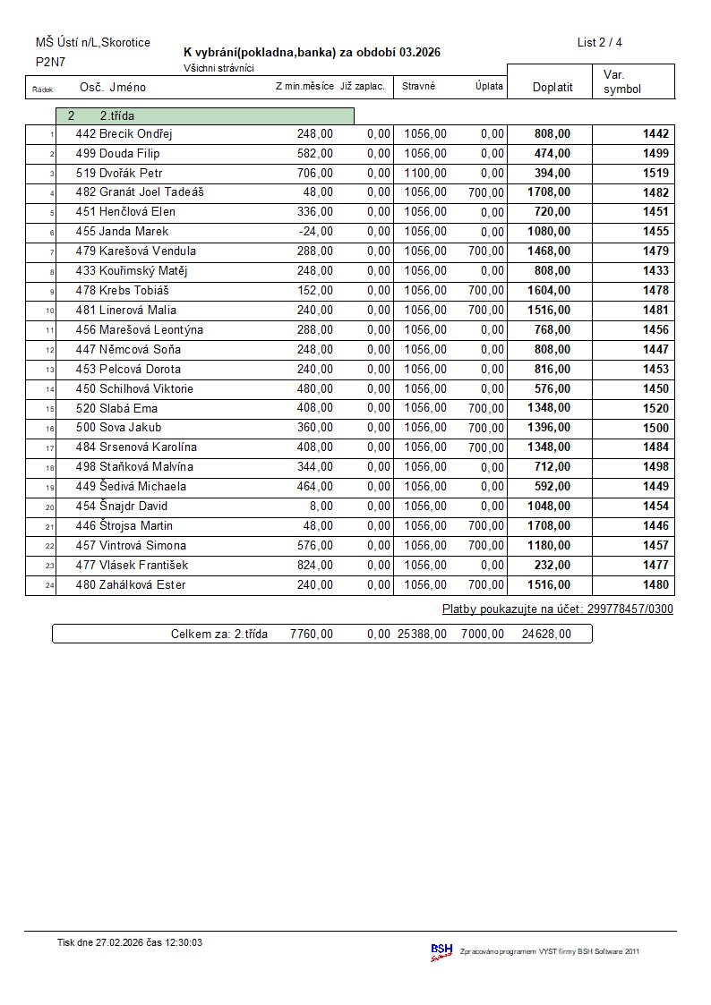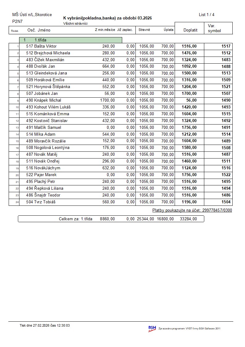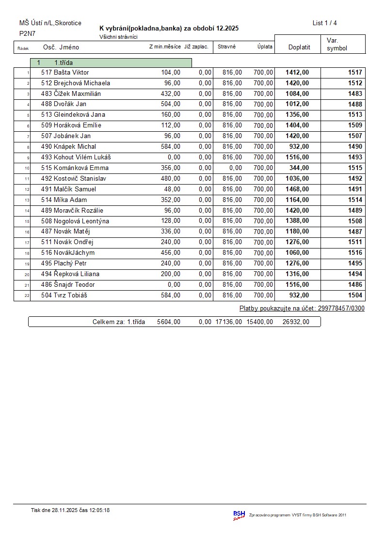 - Platí se vždy na celý měsíc, ve kterém se stravné vybírá. V následujícím měsíci provede VŠJ vyúčtování a odečte odhlášené obědy z předchozího měsíce.